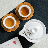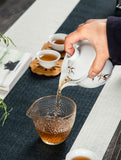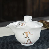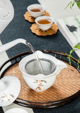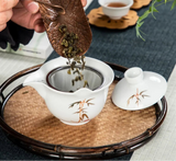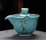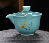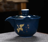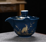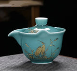 Introducing Gaiwan-Pitchers - the perfect combination! Adorned with stunning golden patterns and traditional designs of herons, cranes, bamboo, clouds, or koi, choose from a blue, celadon, or white jade porcelain body. Its built-in filter and finger grips on the lip make for easy decanting.