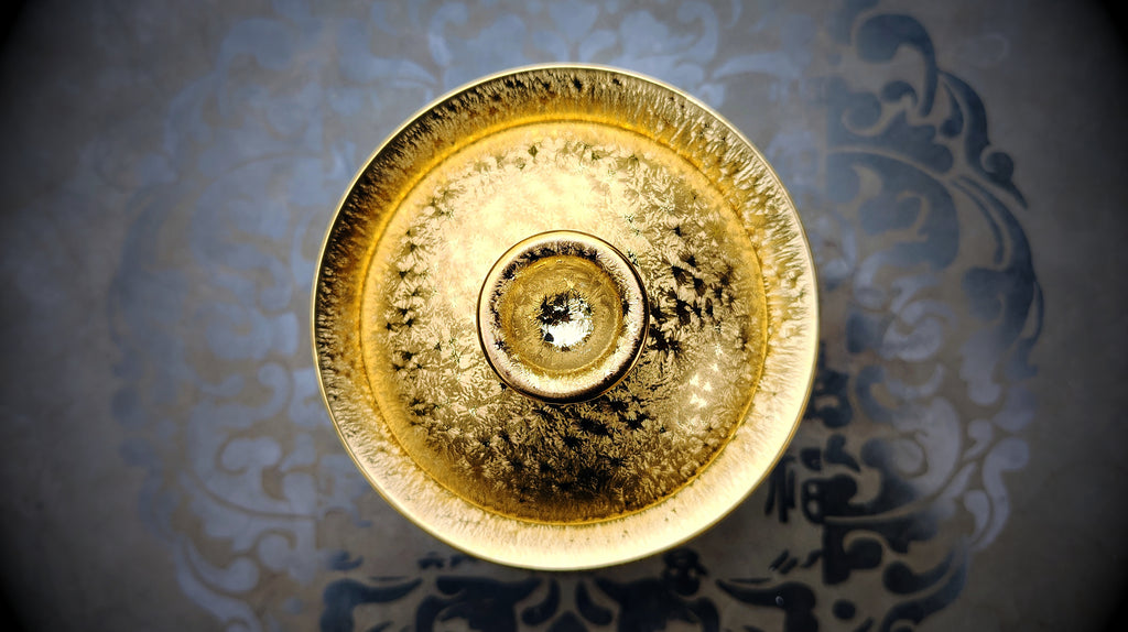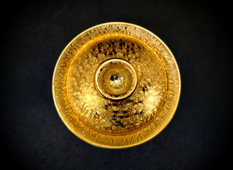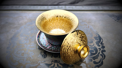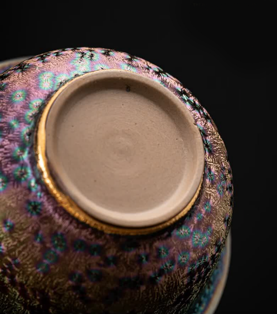 These gaiwans feature an exquisite design with one side adorned in a sparkling rainbow peacock glaze, showcasing iridescent hues, while the opposite side is gilded with genuine gold. The striking contrast of luminous color and precious metal highlights exceptional craftsmanship, offering a sophisticated vessel that combines visual allure with functional elegance.