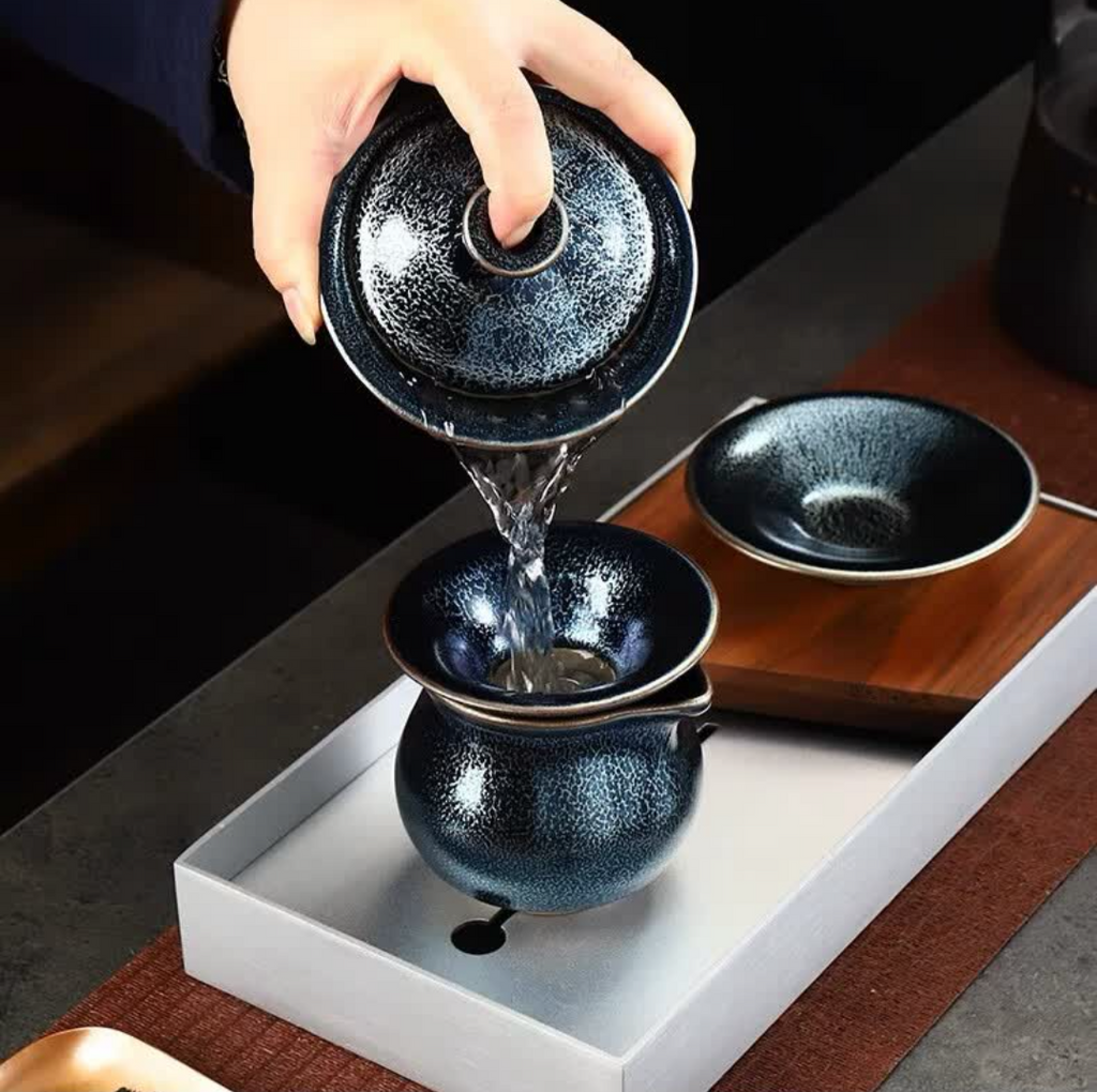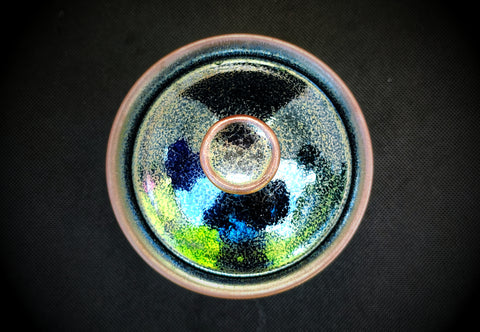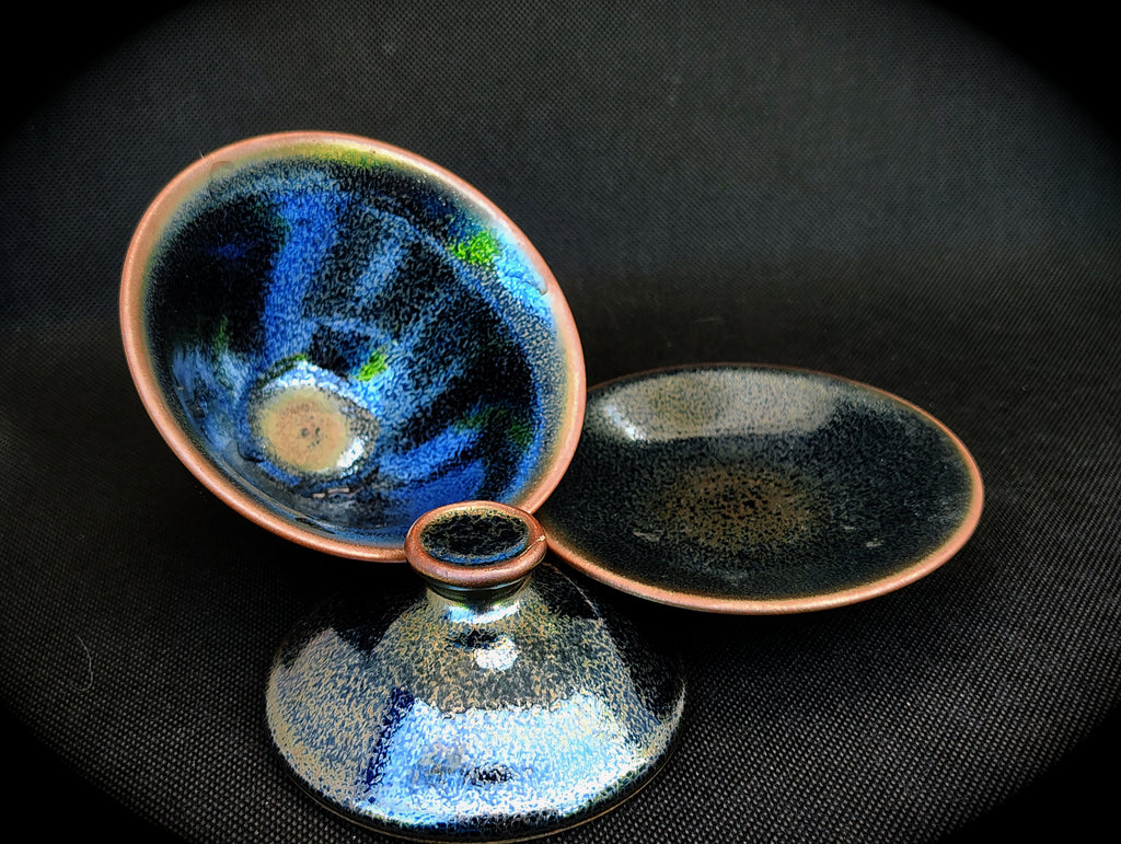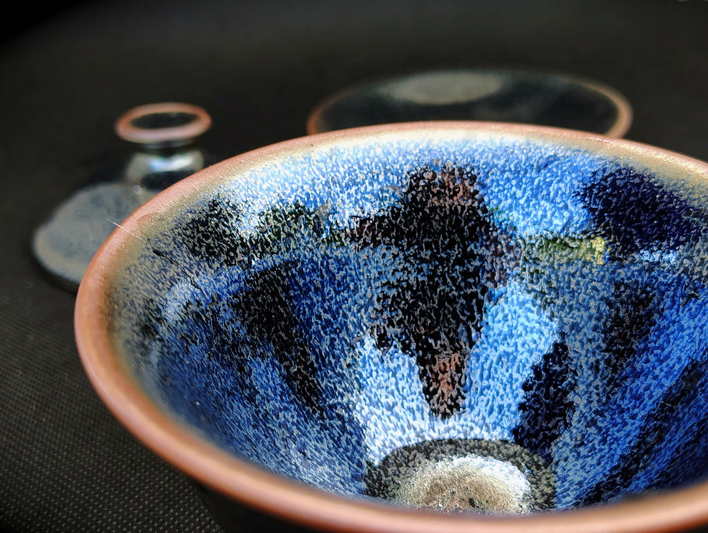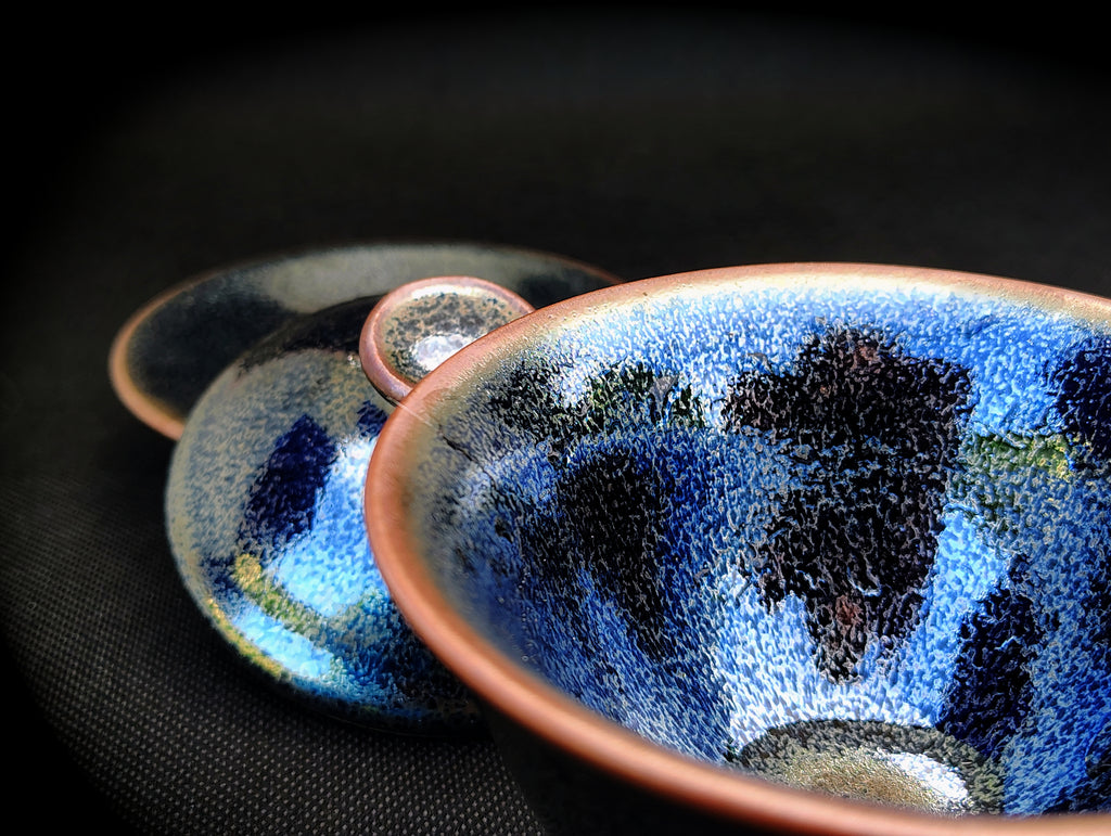 The technique of the glaze known as Jianzhan, also known as Tianmu, or "Eye of Heaven," was invented hundreds of years ago in the Song Dynasty.  It was later lost in China for hundreds of years.  Luckily, this technique was preserved and cultivated by Japanese artisans, who, having initially learned the art from China, introduced it back into China during the 1990's.  This iron-rich glaze is said to help enrich the blood, improve the flavor of the tea, and presents the tea with stunning luminosity.