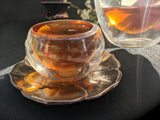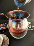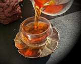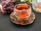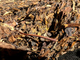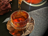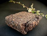 While, at first glance, this may appear to be like any other shou mei, a mixture of brown and black outer leaves, with the occasional silver sheen from the white fuzz of inner bud leaves, breaking into the cake will quickly reveal the Golden Flower at work within.  Dry, the lustrous leaves of this tea impart a rich, tart, dark, woody, fungal aroma, with elements of apricots, tart cherry, and mahogany, with a heavy yun cave element.  They produce an chestnut-amber brew with a medium body and smooth texture.  It leaves the palate with the slightest astringency, but with a clear and resounding yun sweetness that rings on the tongue and palate, giving one the mental feeling of rainwater washing over clean stone.  Its delectable flavor is bright and clear, with tart elements of plum and cherry, as well as almond earthiness, and iron, rainwater, and wet granite yun.  Aging with golden flower has actually been shown to increase caffeine levels, which may explain the buzz of mental stimulation that this tea can impart.